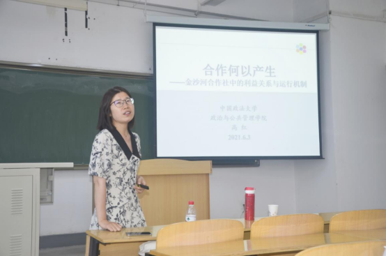 讲座伊始,高老师向同学们介绍闫里村金沙河农业合作社的基本情况、发展历程与运作模式,讲述第一二三产业如何产生合作联动、实现共同发展。紧接着,高老师从合作各方表达诉求、各方初步达成合作意向、合作的展开与实现、合作的持续进行四个阶段来讲述合作形成的过程。在方法层面上,高老师讲道,主要是通过对闫里村村干部、村民进行深度访谈,形成调查研究报告,进而充分了解其合作模式。高老师强调,在做实证研究时,要进行多方考证来研究讨论,形成客观、正确的认识。最后,高老师对合作形成与后期维系的基本要素进行总结,并讲述合作社对我国基层治理的影响,本次讲座圆满结束。