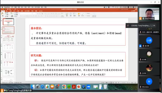 之后,董老师介绍了对外经贸大学目前正在进行的几个探索性分析项目:一、社交隔离:被阻断的社会交往及其政治后果;二、观察者扰动:信号扭曲是如何影响政治运行的;三、恐慌的社会传播:危险信息的流动及其政治后果;四、推荐算法与政治稳定:被推荐的社会骚乱。由于缺乏真实数据,针对上述话题研究,董老师通过社会实验进行观察,包括实验1:选举投票实验——民调的扰动,以解释2016年假民调是如何影响美国选举的,希拉里是如何被假民调欺骗做出错误选择的?实验2:信息传递实验——社交距离对信号传递的影响,以观察人际距离的远近及其互动是否对信号传递产生影响。