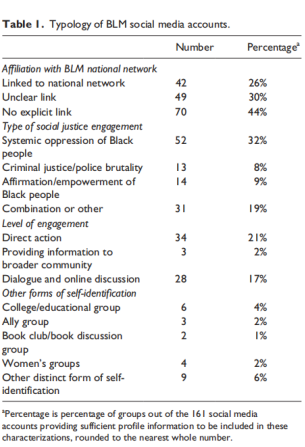 本文是结合多方面并且混合研究方法和数据分析的结果。首先提取了Facebook、Instagram和Twitter的部分用户信息,创建了一个公共“黑命贵”社交媒体账户的综合数据库。这个数据库成为了对附带有Black Lives Matter、BLM或#blacklivesmatter社交媒体标签群体进行定量分析的基础。随后,作者选择这些群体中的一个子集来采访运动内部和整个运动中的社交媒体使用情况。这些访谈围绕社交媒体对扩大社会正义运动的作用(机会和局限性)提出了更深入、更定性的见解。