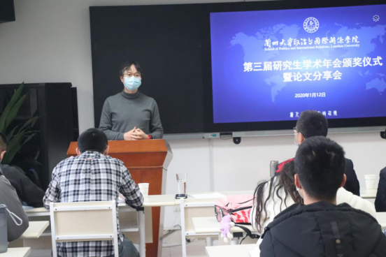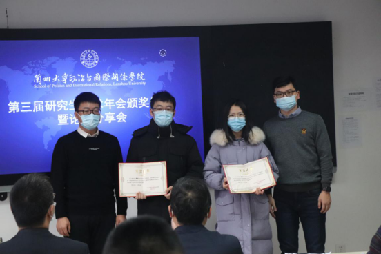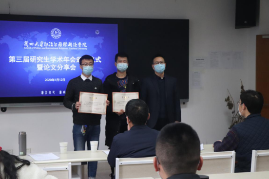 第三届研究生学术年会”获奖名单,评审专家组为获得优秀奖的曹佳鲁、张少文、罗金、史旭潇和祁梦丹等同学颁奖,副院长曾向红教授为获得三等奖的李嘉伟、杨鹏飞和赵柳希三位同学颁奖,院长汪金国教授为获得二等奖尉锦菠和李兴基两位同学颁奖,党委书记姚志海为获得一等奖的赵磊同学颁奖。