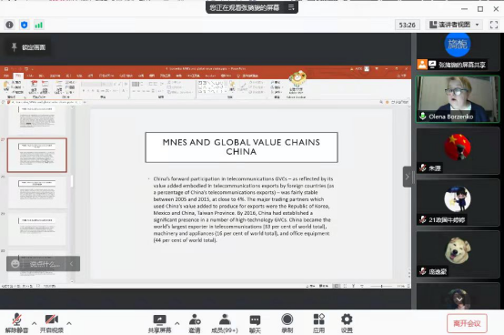 再次,耶列娜研究员分别介绍了中国、印度尼西亚、乌克兰、乌兹别克斯坦、埃及以及墨西哥参与全球价值链的基本情况,具体包括这些国家在全球价值链中所扮演的角色、参与全球价值链对国家经济发展产生的影响,以及跨国公司的发展情况等。