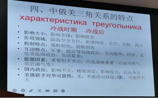 首先,李老师针对三角关系这一概念及其特点进行了详细的阐释。三角关系是指三个国家行为体之间的三边关系紧密互动,相互作用,相互影响,一边关系的变化影响到其他两边关系发生变化。在通过相关数据展示中美俄三国的各种实力对比情况后,李老师提出中美俄之间的三角关系是存在的,尽管三国之间仍存在力量差异,但基本上地位相当,可以进行比较。