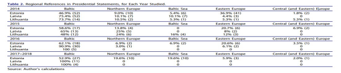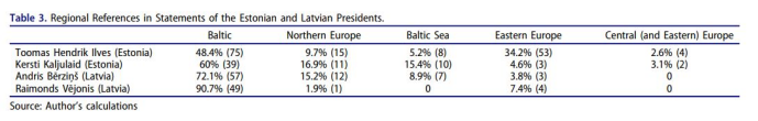 该表证实了早先建立的关于引用波罗的海三国的普遍趋势。“波罗的海地区”的受欢迎程度随着爱沙尼亚和拉脱维亚最近几任总统而上升,而“北欧”则排在第二位。爱沙尼亚总统图马斯·亨德里克·伊尔维斯再次提到“中欧(和东欧)”最少,“东欧”最多。