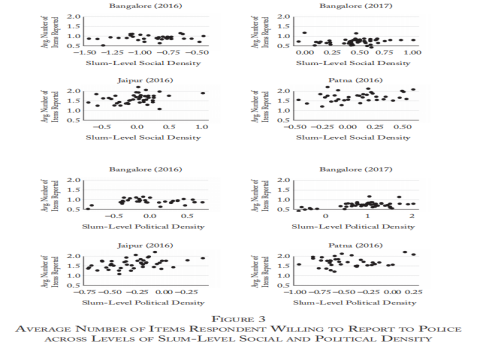 对169名贫民窟领导人的半结构化访谈支持这样一种观点,即他们是将强大的非正式网络与提升警务质量与改善社区安全状况联系起来的一个关键机制。在接受采访的169名领导人中,大约60%的人说有居民来寻求帮助。班加罗尔一个定居点的一位领导人这样描述他的角色:“在贫民窟,最大的问题是警察。即使这是一个小问题,他们也会闯入人们的房子,拖走人们并殴打他们。我们试图通过去专员的办公室来解决这个问题。”
