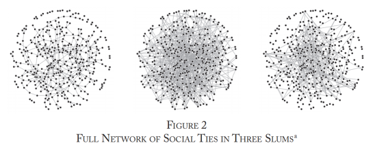 通过一项单独的调查验证了这种测量社会联系的方法,该调查捕获了斋浦尔和巴特那8个贫民窟中所有家庭的社会网络。在这8个定居点中,首先列举了所有成年人的名字,将它们编程成调查问卷,然后回到定居点,询问每个家庭在23个不同的社会、政治和经济网络中互动的个人的名字。社交网络中的关系是由与社会联系有关的问题建立起来的,包括受访者与谁社交,向谁寻求帮助,并提供帮助。图2描述了网络样本中三个选定的贫民窟的社交网络。我们观察到个体层面的社会联系的变化,即每个节点(人)拥有的线的数量,从社会隔离(根本没有连接的节点)到有许多社会联系的个体。同样还观察到,总体贫民窟密度(贫民窟所有节点之间的连接密度)有相当大的变化,例如,中部贫民窟显示出比其他两个更密集的关系。