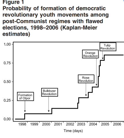 紧接着,作者通过对比苏联时期民族主义的模块化传播和后苏联国家选举后青年社会运动发生可能性进行详细分析,作者在对比后得出结论:在模块化的过程中,后期几率的上涨更多地依赖于榜样的力量,而不是机会结构的促进作用。