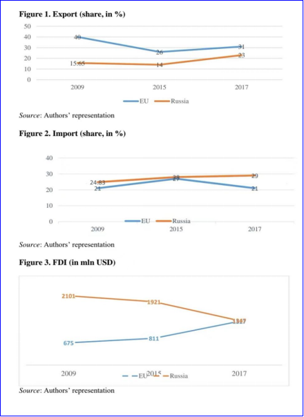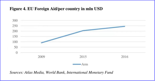 亚美尼亚正在实施相当有效的多元平衡或互补外交经济政策,即使在成为欧亚经济联盟成员国后,仍继续与欧盟进行全面的经济合作。与此同时,欧盟和俄罗斯都没有因为欧盟而限制自己与亚美尼亚的合作,为各方建立了互利合作的平台。下图显示:第一,欧盟和俄罗斯始终在亚美尼亚的经济中都占有较大份额;第二,欧盟和俄罗斯从亚美尼亚进口的份额有所下降,这一点可以从亚美尼亚的国内经济形势中得到解释;第三,随着亚美尼亚加入欧亚经济联盟,欧盟对亚美尼亚的出口份额下降到2009年的水平,而俄罗斯对亚美尼亚的出口则不断上升。第四,没有看到任何明确的证据表明加入欧亚经济联盟对欧盟对亚美尼亚的投资产生了影响。相反,从2009年到2017年,俄罗斯的FDI大幅下降(近两倍),而来自欧盟的FDI几乎翻了一番。第五,欧盟的对外援助从2009年的约9000万美元增加到2016年的近2.5亿美元。此外,欧盟在2017-2020年对亚美尼亚提供的援助为1.76亿欧元(约合2.08亿美元),这是2017年11月亚美尼亚和欧盟签署了一项具有里程碑意义的协议的结果。