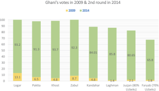 加尼阵营似乎热衷于利用普什图族人。普什图族人对2001年后权力结构的变化不满,其强硬派声称,这种变化损害了普什图族人自1747年阿富汗建立以来一直保持的政治优势。2014年3月28日,在坎大哈的一次竞选中,加尼吹嘘自己在确保巴格拉姆地区监狱释放塔利班囚犯方面发挥的作用。这一说法很大胆,与他对族群派系的强烈诉求相呼应。加尼阵营在第一轮以哈扎拉人为主导的地区表现不佳,他们不得不重新调整竞选策略。在新的竞选策略中,加尼阵营明确了解决哈扎拉人特别关注的问题,如哈扎拉贾特的经济投资、公路和水坝建设以及库奇-哈扎拉土地/牧场争端等问题。此外,加尼阵营在乌兹别克-土库曼选区的表现也不如预期。据一位乌兹别克族议员称,乌兹别克-土库曼选区投票的重要性迫使加尼团队改变战略,以唤起该地区的支持。