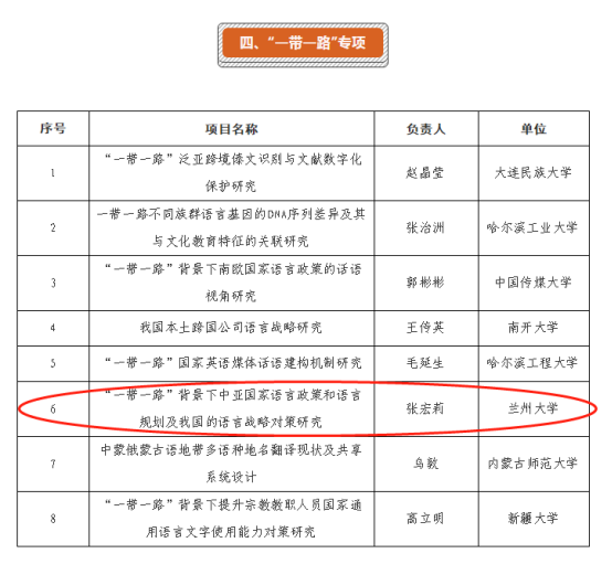 2019年11月25日,国家语委科研办公布了2019年度国家语委科研项目名单,成人直播 张宏莉教授申报的《“一带一路”背景下中亚国家语言政策和语言规划及我国的语言战略对策研究》获得“一带一路”专项立项支持。