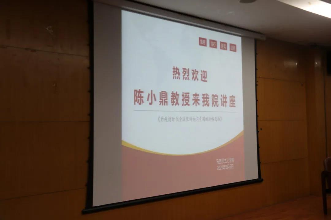 陈小鼎教授讲座共包含三个方面。第一方面,当今国际关系发生了变化。其内容分为世界面临百年未有之大变局、全球化与“逆全球化”交织、新冠疫情重塑国际关系三部分,并说明新冠疫情期间世界经济全面衰退、大国关系继续分化重组、全球化遭遇逆流漩涡、全球治理面临空前危机;第二方面,中美关系。陈老师就中美关系的历史发展、发展变化症结所在和中美未来关系的展望等方面进行介绍;第三方面,中国的战略选择。内外兼修可大可久,要全方面推进国家治理水平和治理能力、提高科技创新能力、推进文化建设、坚持一带一路建设。最后,他“三问诸君”向大家提出三个问题,引导同学们去思考如今中国的发展。