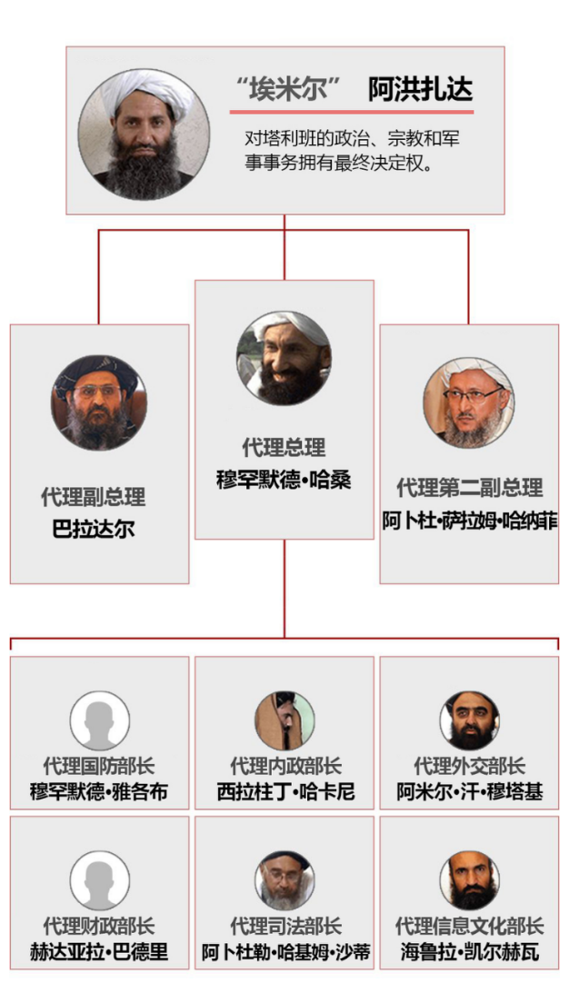 塔利班最高领导人阿洪扎达将以“埃米尔”的身份领导国家,穆罕默德·哈桑出任代理总理,巴拉达尔担任代理副总理。