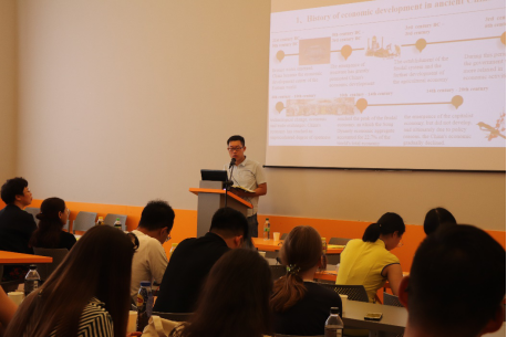 在上午介绍中国概况的部分中,罗金同学从中国整体经济情况和中乌关系整体出发,介绍中国和中乌两国的经济发展情况。紧接着,他又从中国经济发展史、中乌经济交流和中国速度三个方面向师生们详细展示了中国经济从计划经济迈向现代化市场经济的发展历程。在讲到中国速度时,罗金同学通过详实的数据研究,向乌克兰同学展示了中国改革开放以来所取得的经济建设成就。乌克兰同学惊叹于中国经济的发展速度,分别用“fastest(最快的)”、“unbelievable(难以置信的)”等词来形容中国经济的发展,这引起了全体同学们的共鸣。