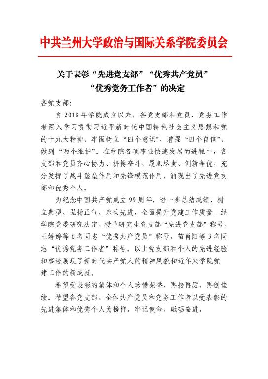 关于表彰“先进党支部”“优秀共产党员”“优秀党务工作者”的决定