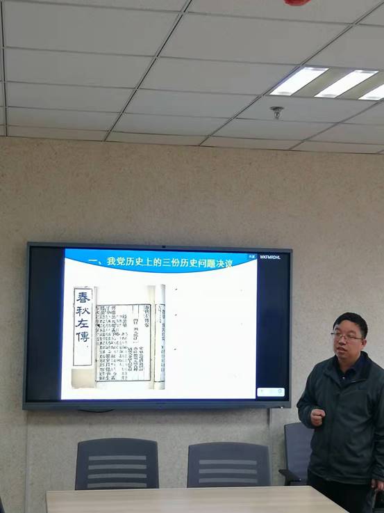 教职工第一党支部举行主题党日活动,曹伟博士以《用历史映照现实,远观未来》为题做了讲座,分享了十九届六中全会通过的《中共中央关于党的百年奋斗重大成就和历史经验的决议》学习心得。