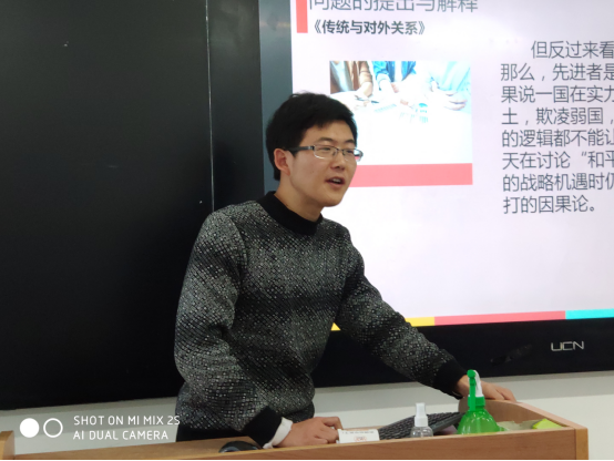 王亚同学从书籍简介、问题的提出与解释、西方国际话语体系与中国困境四个方面展开了对《传统对外关系》一书的解读。他首先讲到该书作者相蓝欣在该书中提出的中心论点,即中美关系的症结在于西方中心论的意识形态,接着详细介绍了作者相蓝欣的生平和著作。其后,王亚同学展示了该书的全部章节目录,并向同学们解释了“意识形态”概念的两层涵义。第三部分的讲述中,王亚同学举以中国近代被侵略的例子,引出“落后就要挨打”的说法,并向同学们深入阐述了中国“落后就要挨打”与“和平崛起”表述的由来。随后,王亚向同学们说明了政治学与社会学中对于“话语”一词的界定。他指出全盘接受西方话语存在的陷阱,这会加剧中国在世界话语竞争中所处的劣势,并提出了如何有效破解西方话语霸权的一些途径。讲解尾声,他指出了“中国将自己的文化传统融入国际关系研究中难以摆脱西化”的困境。王亚同学还提到,中国并不缺原创性理念,然而,在论证其合理性与有效性时却在无形中受制于西方霸权话语体系,这意味着中国在创新理念和理论时仍任重道远。