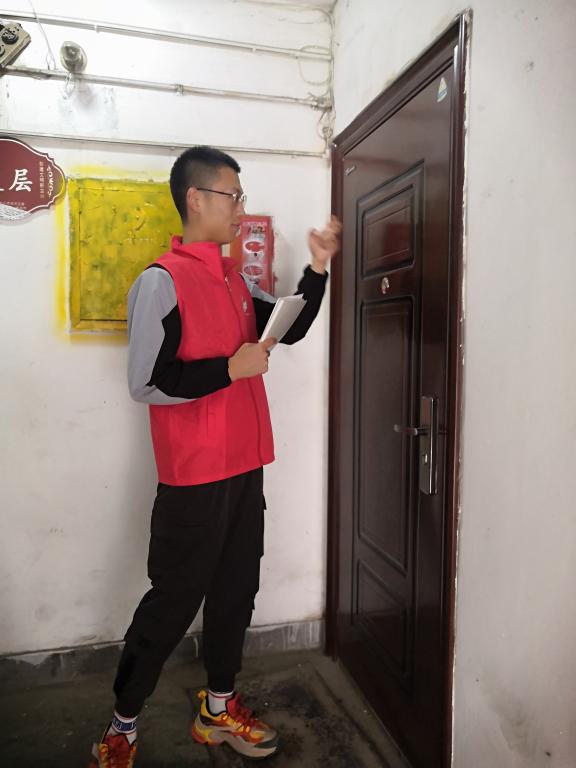 学生跟随社区队伍对一栋居民楼进行挨家挨户的敲门探访,挨家挨户开展调查活动。在实践中学生与各式各样的人沟通,从社区工作者身上学会了以亲和的形象与所有人沟通交流,在多次的入户调查后,与保安一声“麻烦你了,我们又来了”,相互间的微笑点缀了实践之路。