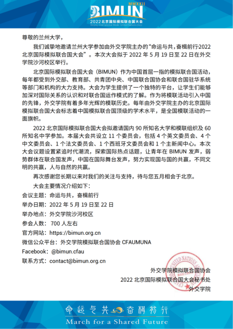 邀请,参加北京国际模拟联合国大会(Beijing International Model United Nations 2022)。作为中国首屈一指的模拟联合国活动,该活动每年都受到外交部、教育部、共青团中央、中国联合国协会和联合国驻华系统等部门和机构的大力支持。大会为学生提供了一个独特的平台,能够让学生们加深对国际关系的认识和联合国运作模式的了解。本次大会议题涵盖广泛,涉及健康、网络犯罪、安全、环境保护,数字建设等,共设立11个委员会,包括4个英文委员会,4个中文委员会,1个法文委员会、1个西班牙文委员会和1个主成人直播。
