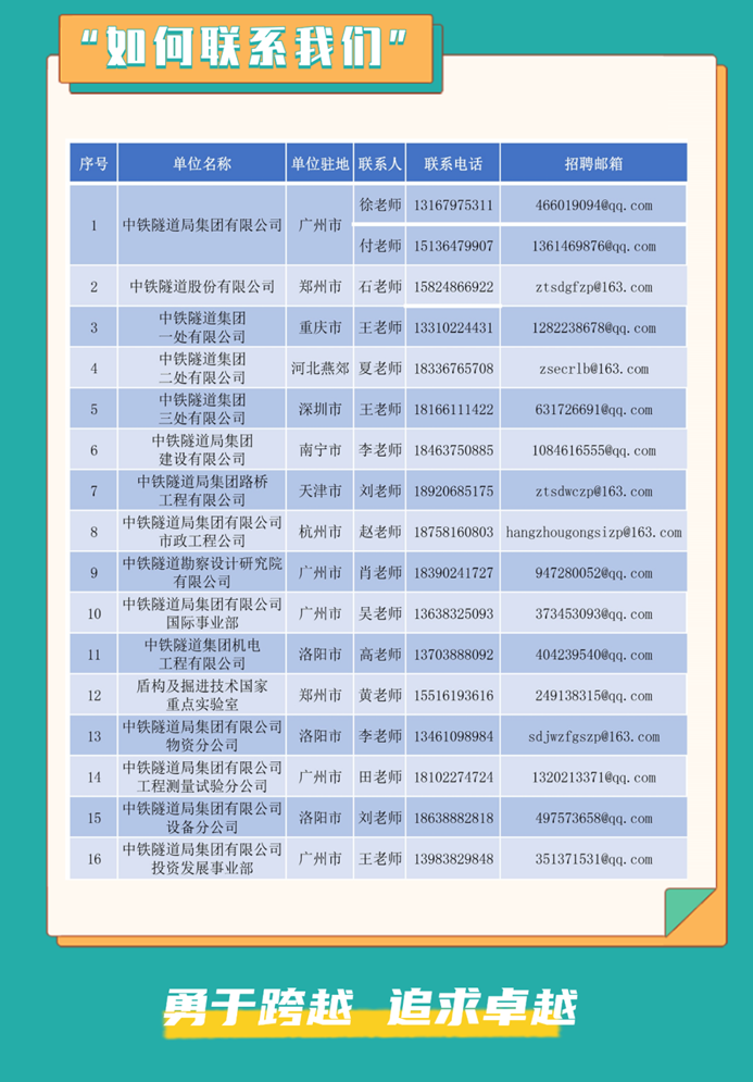 世界500强中国中铁股份有限公司的骨干成员企业,是一家集设计、科研、投资、施工、修造、运维六大功能为一体的综合企业集团,业务涵盖全部基建领域。具有铁路、公路、市政施工总承包特级资质,铁道、公路、市政行业甲级设计资质,甲级测绘资质。隧道局为中国隧道与地下工程领域国家队,公司80%以上项目为市政地铁项目,可结合毕业生自身情况就近安排工作地点,以市区为主。可选择落户广州、深圳、天津、重庆、杭州、郑州等重点城市,并享受相应城市人才政策。企业其他福利包括六险一金,节日福利,安家费用,带薪年假/暑假/法定假,年终奖,年度旅游,户口迁移等。