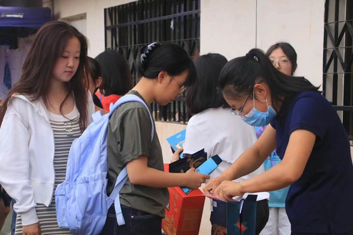 的关心与关怀充盈在运动场闷热的空气里,寄予在每一盒中秋大礼包中,将之交由新生手中的那一刻,那份温情就此顺着手心向下坠的重量,千丝万缕流淌进每位新生的四肢百骸。