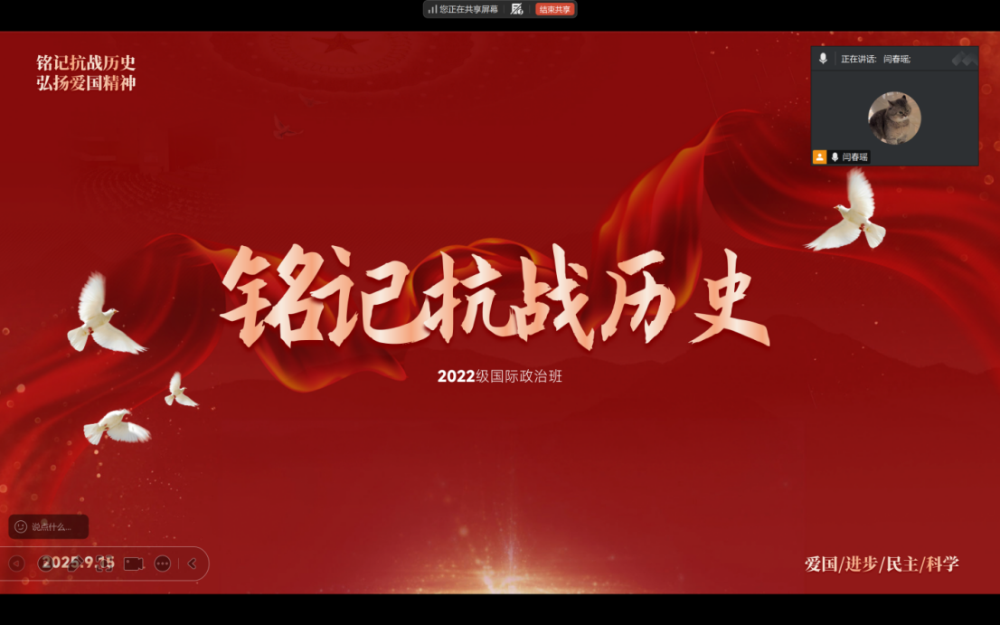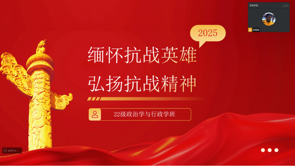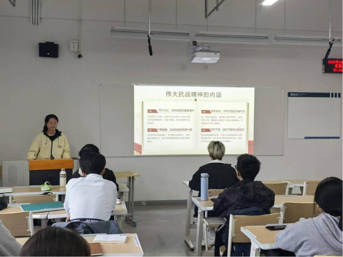 各班级联动开展“沉浸式”爱国主义教育活动。2022级政治学与行政学班班长陈寒璐同学围绕“缅怀抗战英雄,弘扬抗战精神”开展主题班会,以时间轴方式梳理抗战历程,结合淞沪会战、平型关大捷等重要战役与英雄事迹,组织同学们深入探讨爱国主义教育的时代意义,引导大家在历史回望中筑牢信仰根基、凝聚精神力量。