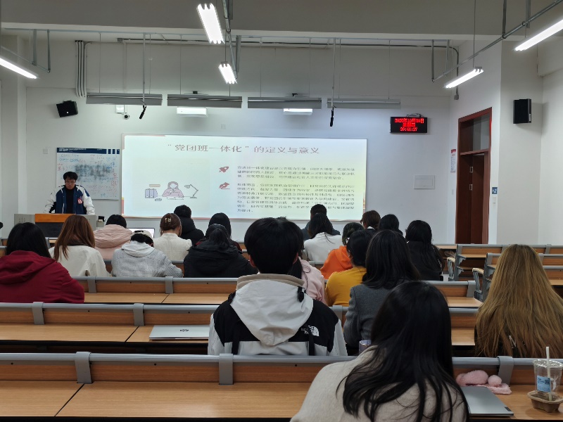 特色与专业背景,引导同学们深入理解党团班一体化建设在凝聚青年共识、提升组织活力、服务学生成长方面的重要意义;团支书陈紫嫣则围绕团组织在联系青年、服务青年、引领青年方面的具体作用,分享了团组织在推动理论学习、志愿服务和社会实践等方面的积极探索。