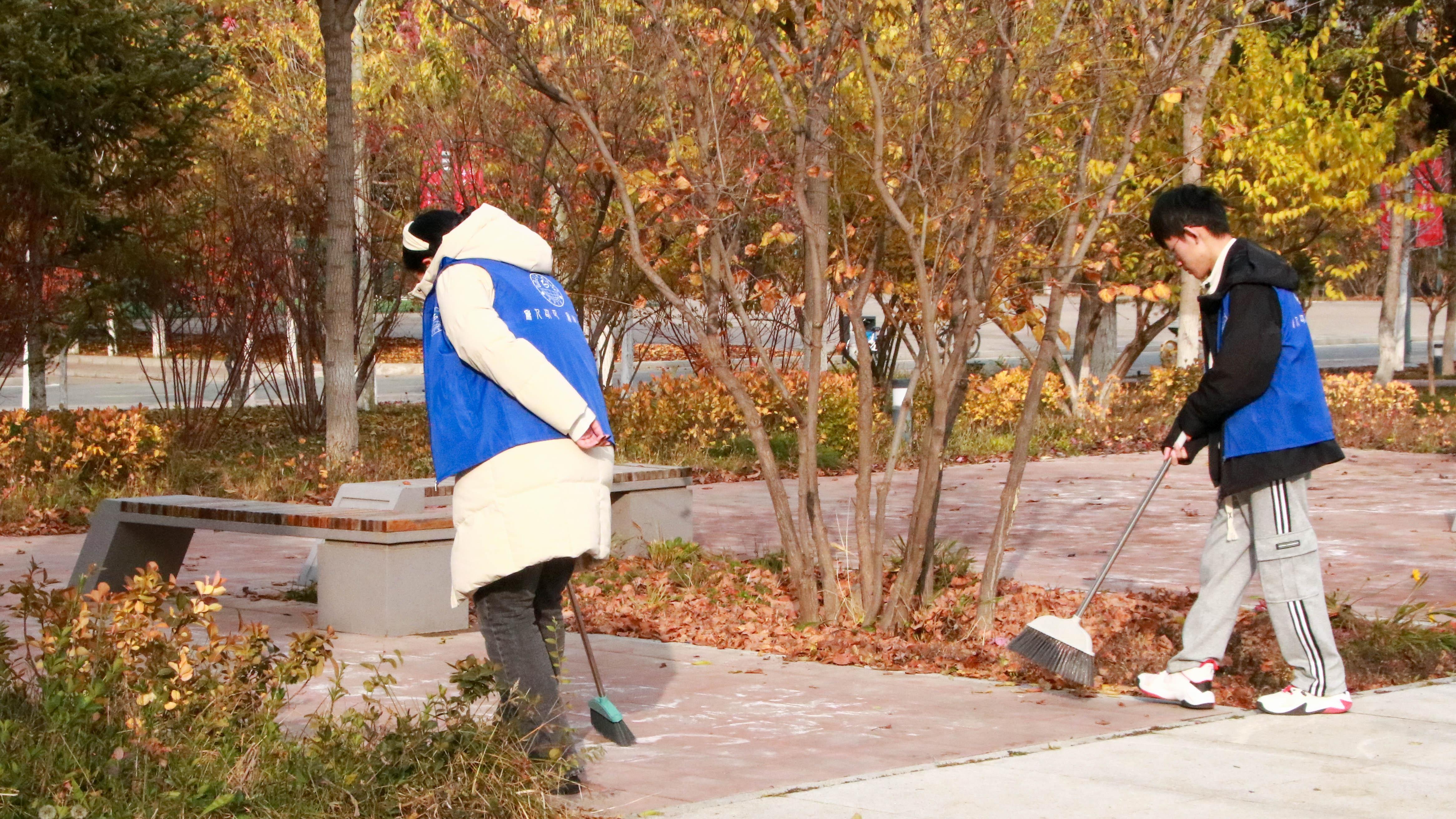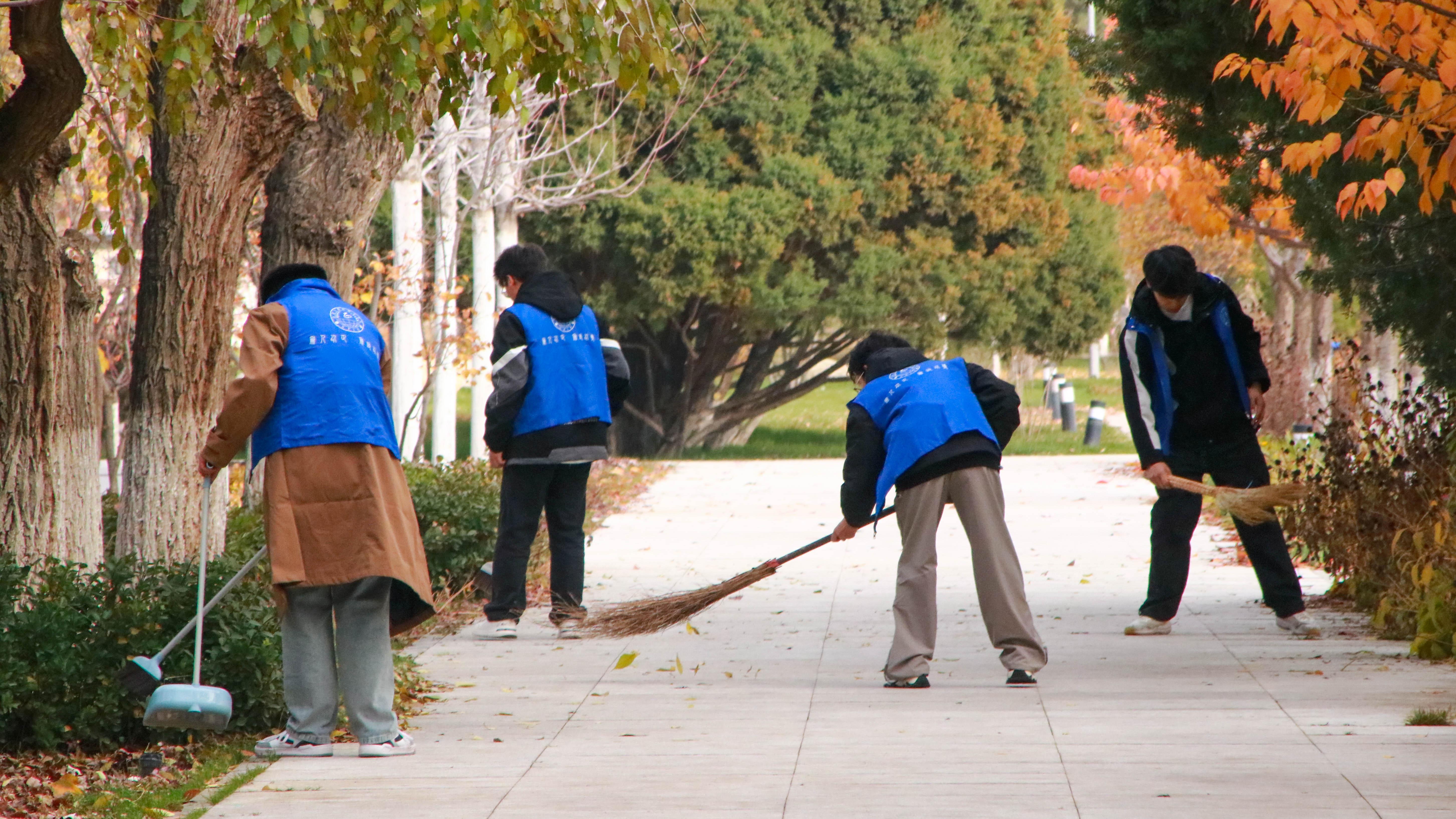 党员志愿者自备清洁工具准时集结,在组织者明确清扫范围与安全注意事项后,大家迅速投入劳动。深秋的至公楼前落叶纷叠,党员志愿者们手持扫帚、簸箕等工具,分组协作,默契配合。有人负责将分散的落叶聚拢成堆,有人负责装袋清运,还有人细致清理绿化带中的纸屑杂物。尽管秋风微凉,党员志愿者们热情高涨,忙碌的蓝色身影在校园中形成一道亮丽的风景线。