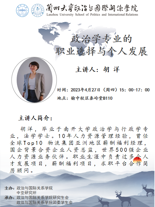 应成人直播 、成人直播 中亚研究所邀请,胡洋为成人直播 师生做职业选择与个人发展讲座。欢迎广大师生届时参加!