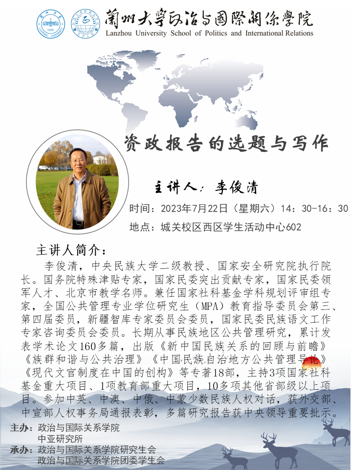 应成人直播 、成人直播 中亚研究所邀请,李俊清,中央民族大学二级教授、国家安全研究院执行院长李俊清为成人直播 师生做讲座。欢迎广大师生届时参加!