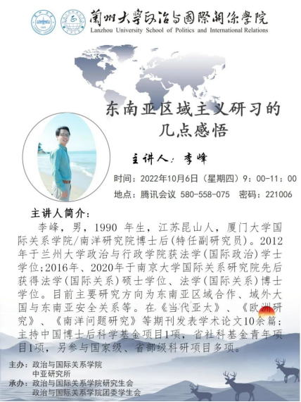 Invited by School of Politics and International Relations of Lanzhou University and Institute for Central Asian Studies Lanzhou University, Li Feng, postdoctoral research fellow of School of International Relations/ Research School for Southeast Asian Studies, Xiamen University, will give an academic lecture for the teachers and students of our school. All teachers and students are welcome to attend.