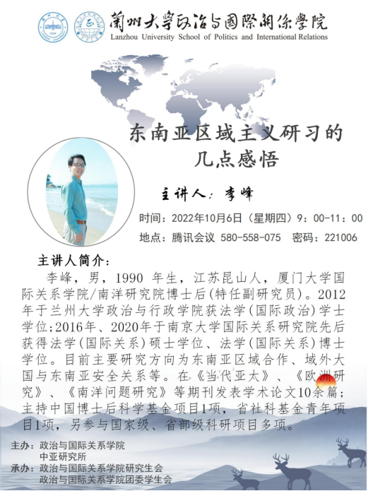 Invited by the School of Politics and International Relations of Lanzhou University and the Institute for Central Asian Studies of Lanzhou University, postdoctoral researcher Li Feng from the School of International Relations/Research School for Southeast Asian Studies, Xiamen University will give an online academic lecture. All the teachers and students are welcome to attend.