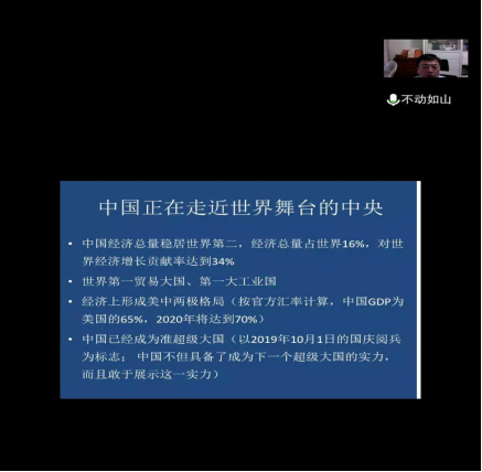 On the morning of September 10th, invited by the School of Politics and International Relations and Institute for Central Asian Studies,Lanzhou University, the Dean of School of Politics and International Studies, Central China Normal University, Director of Center for One Belt and One Road Studies,Professor Hu Zongshan made an online academic lecture entitled "New Crown Epidemic and Sino-Us Relations: Hot Topics and Cold Thoughts" . Professor Zeng Xianghong, Associate Dean of our School,presided over the lecture. More than 160 teachers and students from inside and outside the School attended the lecture.