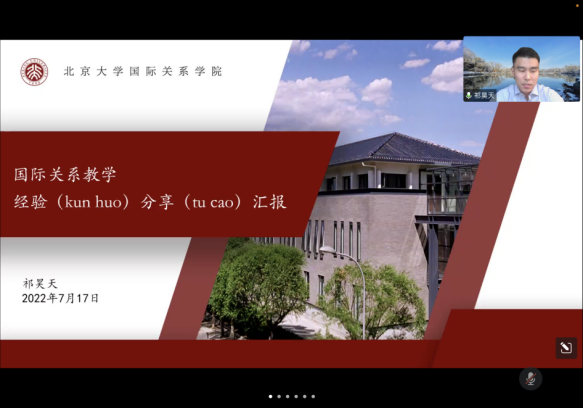 Mr Qi Haotian from the School of International Relations, Peking University, shared his experience of teaching the subject of international relations. Firstly, Mr. Qi shared the key points and difficulties he encountered in the teaching process from the perspectives of tradition and innovation, theory and history, theory and practice, and the integration of multiple approaches. Secondly, Mr. Qi focused on how to develop students' theoretical thinking in the context of the reading-discussion-writing triad. Finally, Mr. Qi introduced multimedia teaching, English immersion classroom and simulation exercises, hoping to use these methods to enrich the classroom format and cultivate students' motivation.