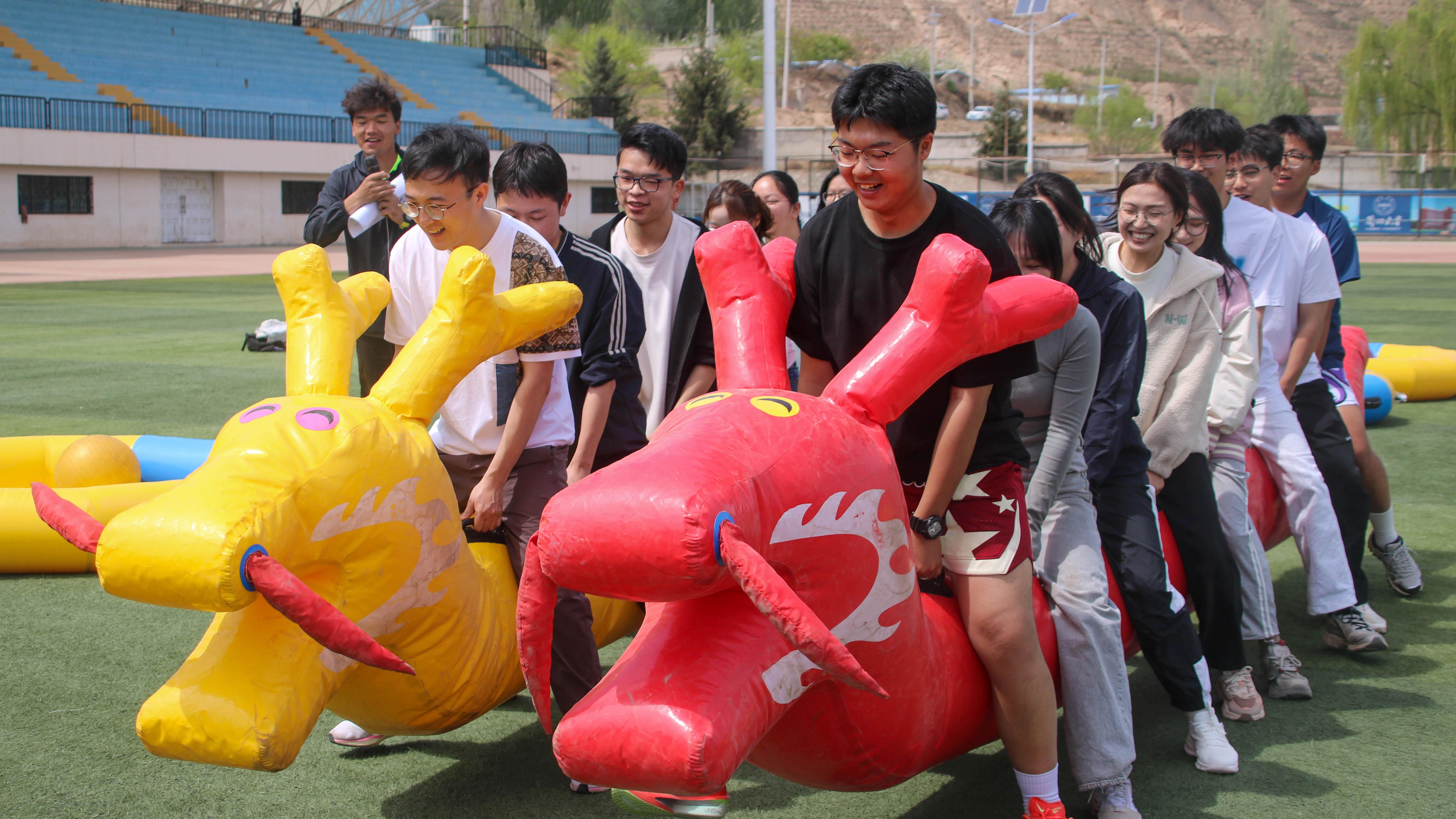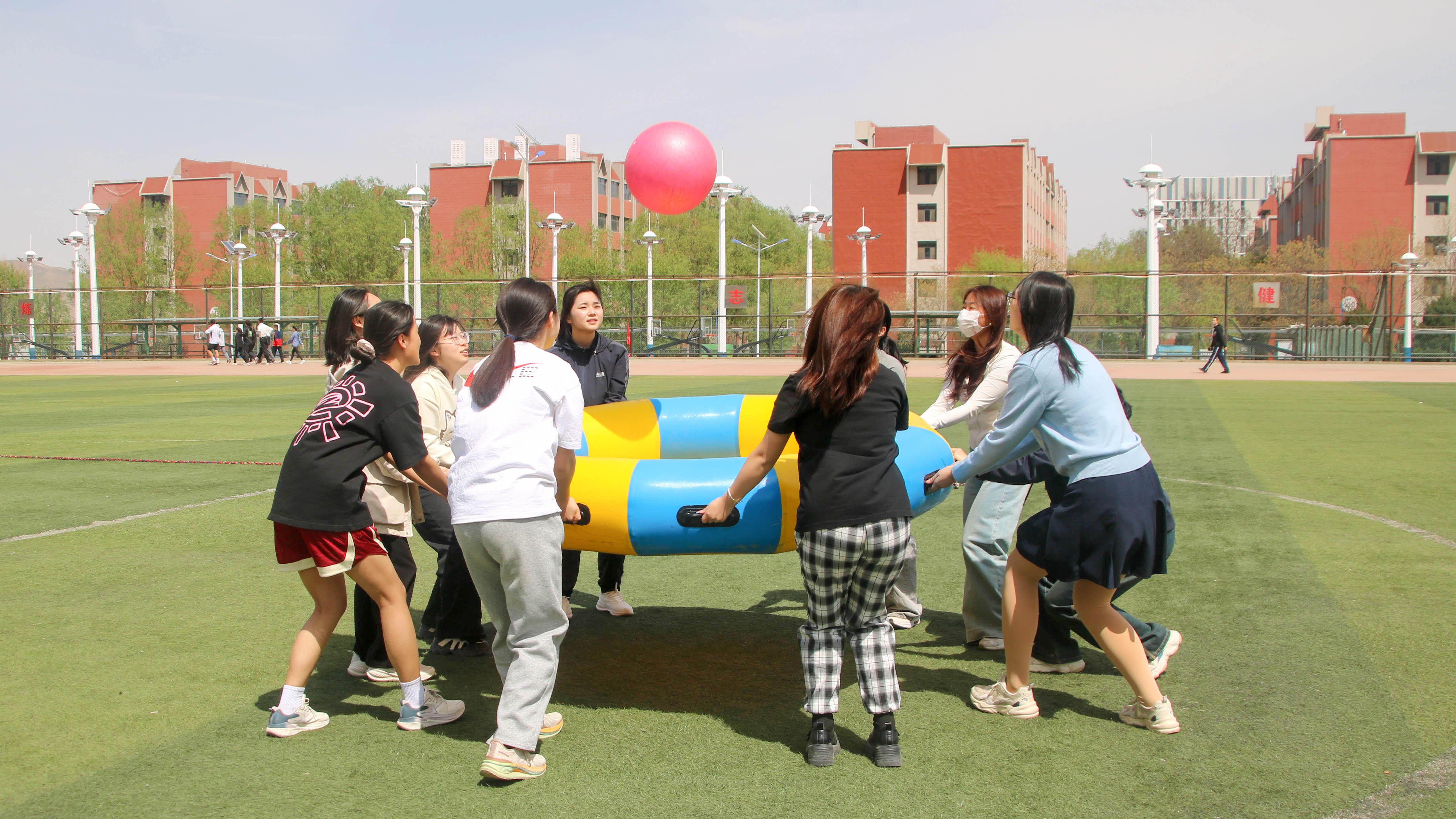 运动会在欢快的氛围中拉开帷幕,集体项目率先登场。同学们精神抖擞,意气风发,在赛场上展开激烈角逐。“旱地龙舟”项目中,参赛选手们骑在充气龙舟上,步伐一致,口号响亮,齐心协力向前冲刺,考验着队员们的默契配合;“同舟共济”里,队员们共同站在狭小的垫子上,凭借团队协作保持平衡,稳步前进,充分展现了团队的智慧与凝聚力;“众星捧月”则要求队员们用充气托盘合力托起大球,既要保证球的稳定,又要追求速度,现场加油声、欢呼声此起彼伏。此外,“袋鼠跳”“骑马打仗”“打沙包”等趣味项目也让赛场充满了欢声笑语,同学们在竞技中尽情释放青春活力,享受运动带来的快乐。
